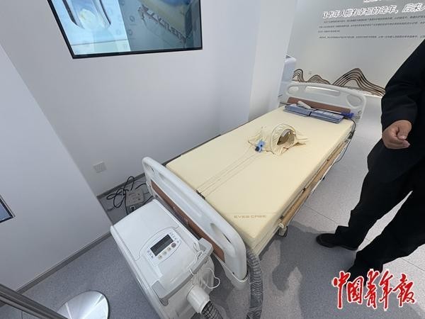 江苏南通长护险产业园展示的智能家用照护床,可以自动处理失能人员排泄物,图中左侧的机箱用来存储排泄物。中青报·中青网记者 刘昶荣/摄