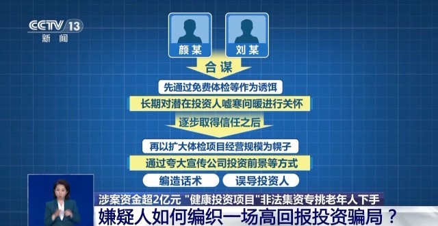 那么,颜某是如何想到以投资体检项目为名义,吸收投资人资金的呢?警方发现,这家体检中心目前还有一个大股东刘某,他的名下还有一个所谓的健康产业公司,两人合谋之下,先是通过免费体检等作为诱饵,长期对潜在投资人嘘寒问暖进行关怀,逐步取得信任之后,再以扩大体检项目经营规模为幌子,通过夸大宣传公司投资前景等方式,编造话术,误导投资人。