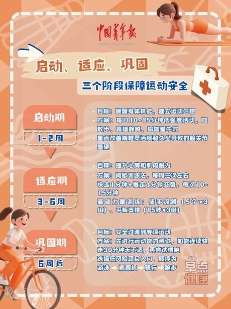 张乐伟表示,长期缺乏运动的年轻人,突然进行剧烈或高强度运动时,身体可能因不适应出现多种反应,甚至面临潜在风险。因此,前期的准备阶段必不可少。这一阶段包含启动期、适应期和巩固期。