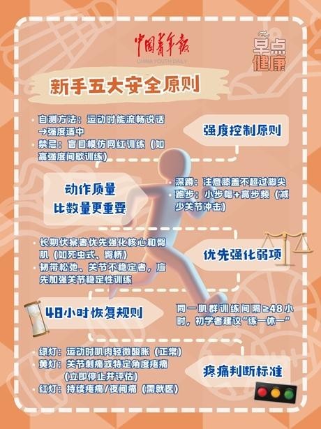 “最好的第一次运动,是让你还想第二次的运动。”国家体育总局运动医学研究所运动康复研究中心主任张乐伟说。安全运动的核心是尊重身体信号,用科学代替蛮力。他建议,应从最小有效运动量开始,逐步升级。“运动损伤不是偶然,而是错误积累的必然,做好细节管理,才能长期受益。”