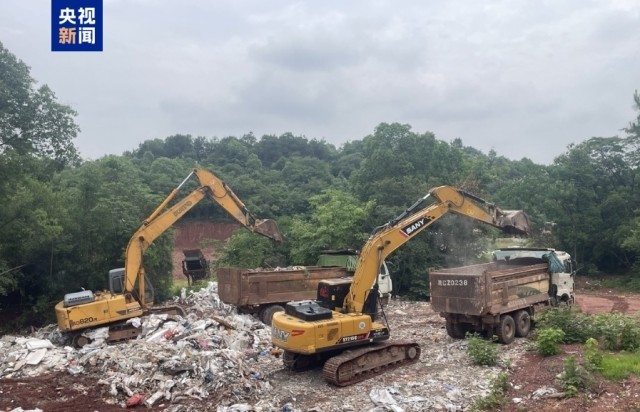 5月19日上午,雨湖区长城乡黑家湾社区和湘潭县易俗河镇水竹湾村现场已有数台挖掘机、渣土车在现场作业,清运垃圾。