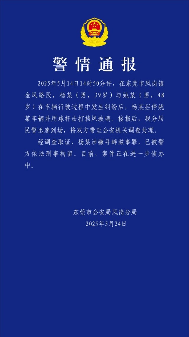 央视网消息:据“凤岗公安分局”微信公众号消息,5月14日14时50分许,在东莞市凤岗镇金凤路段,杨某(男,39岁)与姚某(男,48岁)在车辆行驶过程中发生纠纷后,杨某拦停姚某车辆并用球杆击打挡风玻璃。接报后,东莞市公安局凤岗分局民警迅速到场,将双方带至公安机关调查处理。