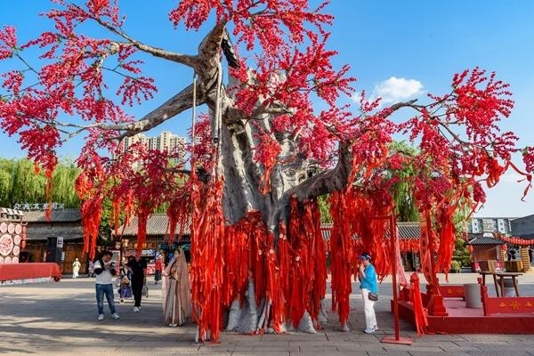 2024年5月17日,河南洛阳,洛邑古城。游客在许愿树挂上红色缎带,许下心愿。视觉中国供图