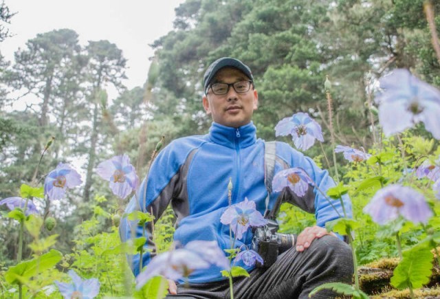 2022年7月,云南省丽江市老君山九十九龙潭,魏行智调查高山植物藿香叶绿绒蒿种群状况。受访者供图