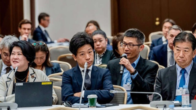 2025年2月18日,日本东京,张伟建(持话筒者)参加世界经济论坛举办的人工智能时代的气候与大自然领导者会议。受访者供图