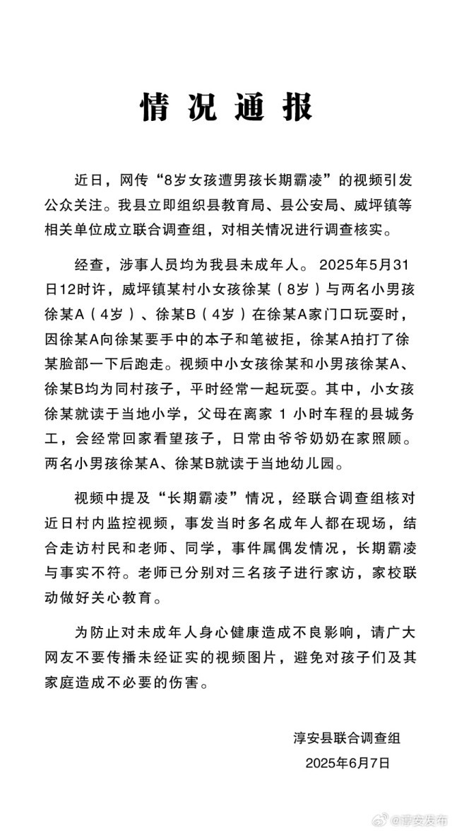 视频中提及“长期霸凌”情况,经联合调查组核对近日村内监控视频,事发当时多名成年人都在现场,结合走访村民和老师、同学,事件属偶发情况,长期霸凌与事实不符。老师已分别对三名孩子进行家访,家校联动做好关心教育。