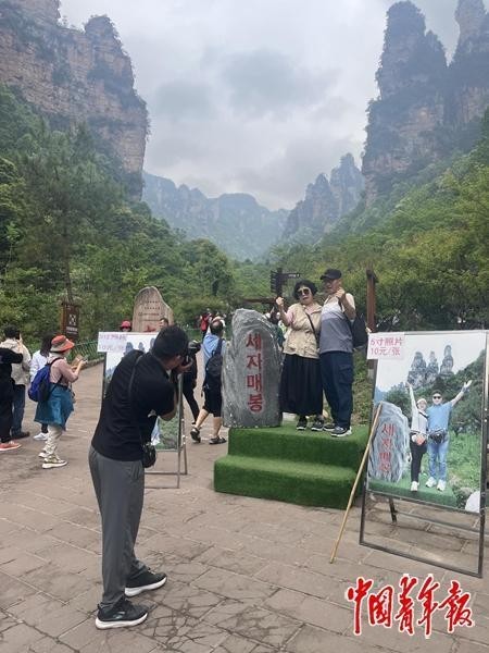 张家界国家森林公园景区,工作人员正在给韩国游客拍照。中青报·中青网记者 裴思童/摄