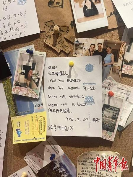 张家界一家民宿的留言墙上,来自世界各地的游客照片、寄语。中青报·中青网记者 裴思童/摄