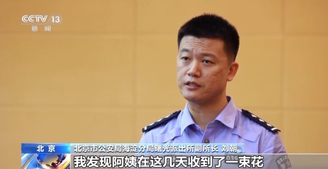 北京市公安局海淀分局曙光派出所副所长 刘朝:在劝阻过程中,我发现阿姨在这几天收到了一束花,因为花是一个很特别的事儿。因为在我们办案过程中发现,很多嫌疑人利用这种线下代送鲜花的形式,让事主去更加信任他是一个活生生存在咱们身边的人,然后我提到鲜花的事以后,事主的表情有所变化,突然就意识到这个事有问题了。