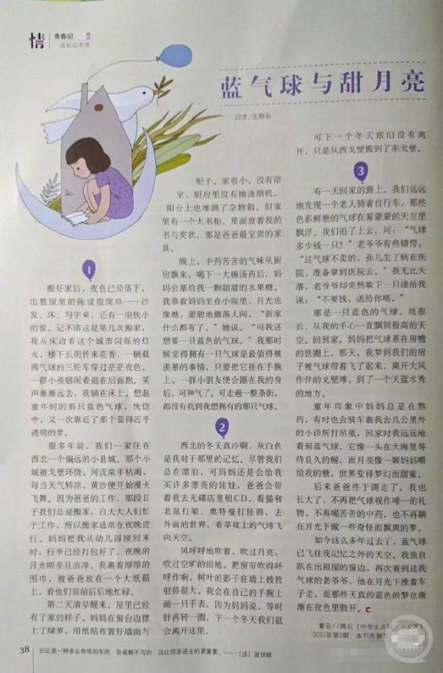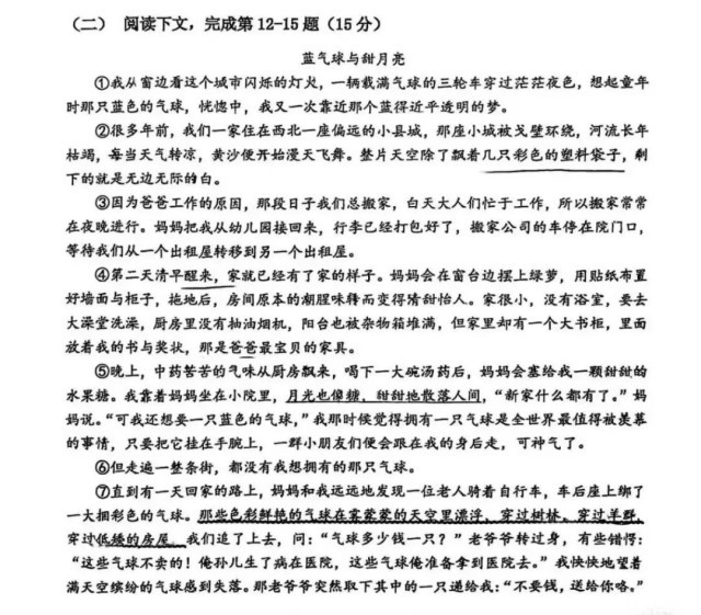 记者注意到,在王彤乐发出的图片中,《蓝气球和甜月亮》成为了阅读理解中的阅读材料,注明有删改,共设了4道题(12-15题),共15分,其中13题是选择题。