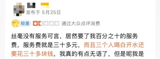 该账单显示,用餐人数为2人,除菜品外,包括一壶陈皮水58元、白开水费11元以及10%的服务费。网友纷纷表示不解: