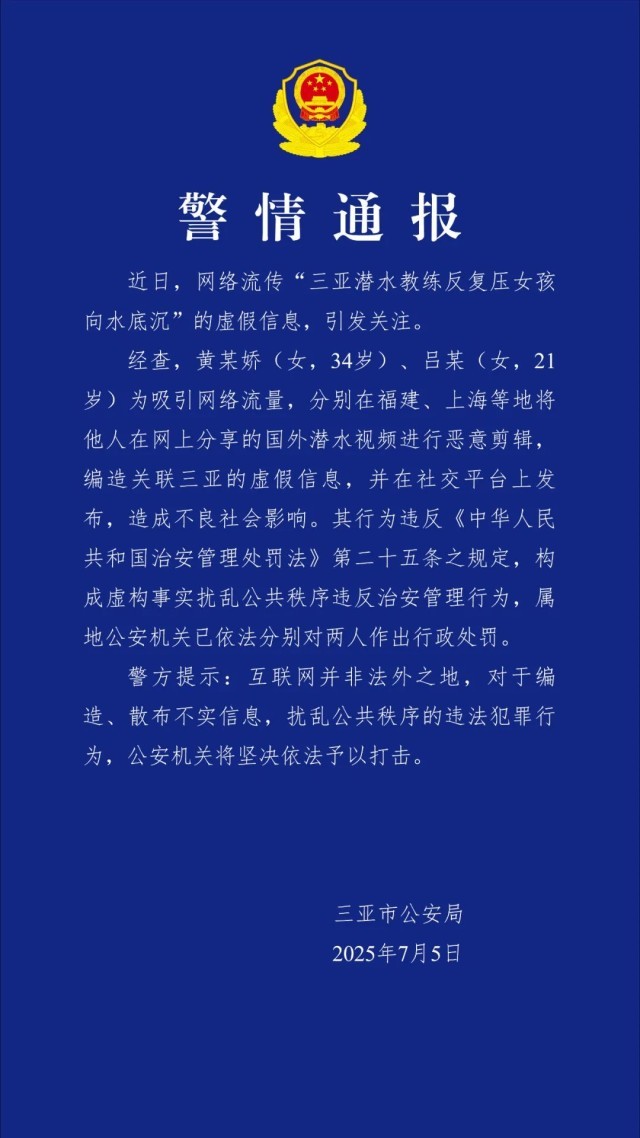 造谣三亚潜水教练反复压女孩向水底沉,2人被罚