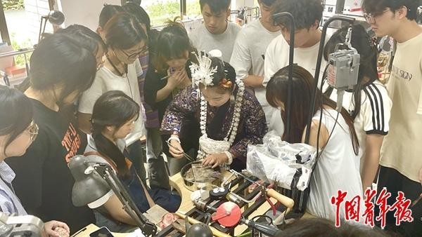 万兰芳教授贵州民族大学学生苗族银饰锻制技艺。中青报·中青网记者 李丹萍/摄