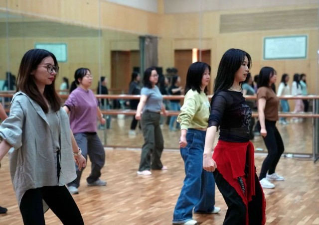 4月7日晚,在上海市群众艺术馆,爵士舞课程的学员们在上课 刘颖 摄
