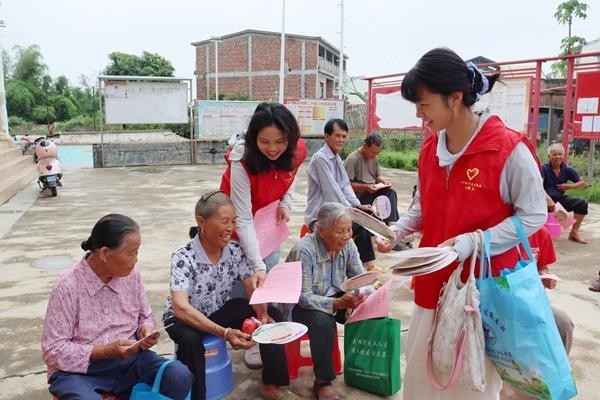 百色市田阳区百育镇移风易俗劝导队到六联村那贯屯开展移风易俗宣传活动,向群众发放移风易俗倡议书、赠送宣传扇。百色市委宣传部供图
