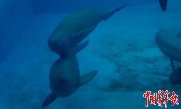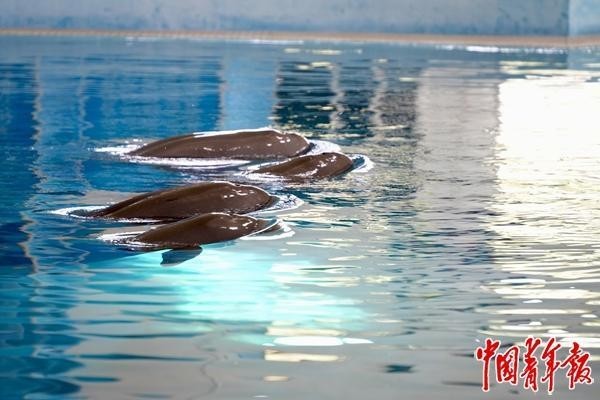 在水生所白鱀豚馆中,6头长江江豚在池中游曳。水生所经过近30年努力,构建起人工环境下长江江豚饲养繁殖技术体系。