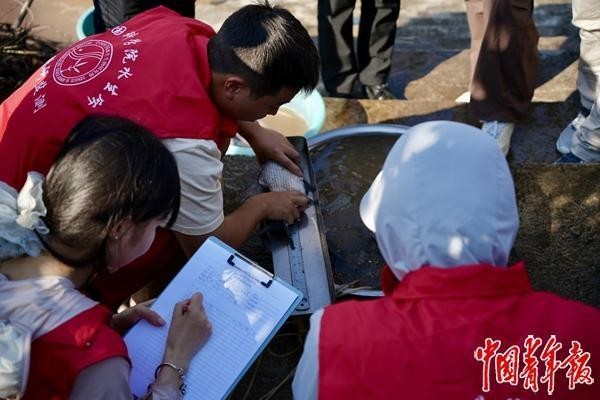 7月28日,中国科学院水生生物研究所助理工程师何雨琦等科研人员测量和记录鱼类数据。中青报·中青网见习记者 崔文瀚/摄