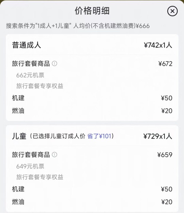“按照成人优惠价买了儿童机票,基建燃油应该按儿童票的优惠走,但最后发现,是按成人标准来算的。”近期,网友小莫在某在线旅游平台购买了“一大一小”两张机票,从杭州飞往青岛,平台显示儿童可购买成人折扣票,票价为533元。小莫支付后却在明细中发现,儿童票的基建燃油费按成人标准收取,两者相差了60元。