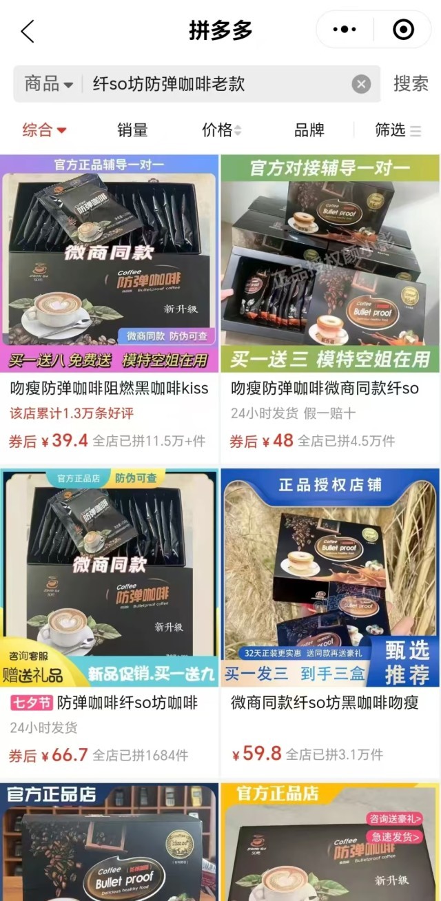 澎湃新闻查询发现,京东、淘宝、拼多多、抖音等多个平台,至今仍然有大量“kiss so”“纤so坊”“so 吧”等减肥咖啡销售,有的店铺销售1万+,有的已拼11.5万+。记者以顾客身份咨询,商家称,产品包瘦,并升级了新品、新包装。在小红书、快手等平台,到处可见此类减肥产品的宣传、推广。