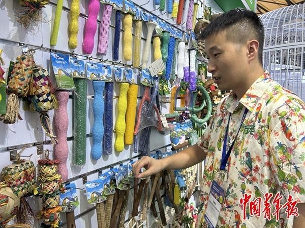 参展商向记者介绍其售卖的各种手工鸟类用品。中青报·中青网记者 魏其濛/摄