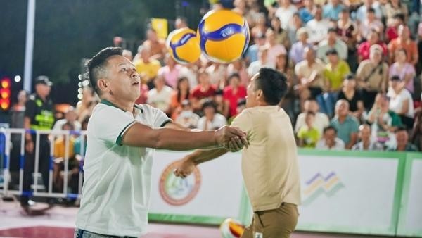 9月11日晚,2025年澄迈和美乡村排球联赛暨全国和美乡村排球测试赛的比赛间隙,当地群众参加排球垫球互动活动。赛事主办方供图