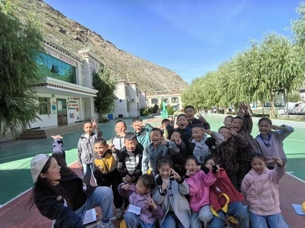 西藏自治区林芝市朗县金东乡中心小学教师才旺卓玛(左一)与孩子们在一起。受访者供图