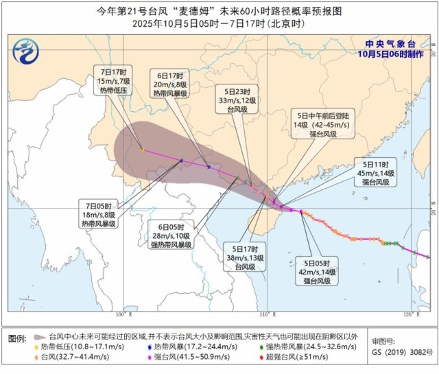 大风预报:10月5日8时至6日8时,南海西北部和中西部海域、东沙群岛、西沙群岛、北部湾、琼州海峡、广西南部及沿海、广东南部及沿海、海南岛及沿海将有6~8级、阵风9~10级的大风,其中,南海西北部海域、琼州海峡、北部湾北部海域、广东雷州半岛及沿海、广西沿海、海南岛东部和北部沿海的风力有9~11级、阵风12~13级,部分海域或地区风力可达12~14级,阵风15~16级。