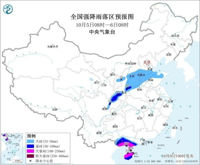 降水预报:10月5日8时至6日8时,海南岛大部、广东西南部、广西南部等地部分地区有暴雨到大暴雨,局地特大暴雨(250~320毫米)。