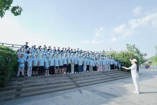 黄河文化“豫”苗研学公益活动“开封站”研学团在开封悬河奇观观景台上齐声唱响《保卫黄河》。石静怡/摄