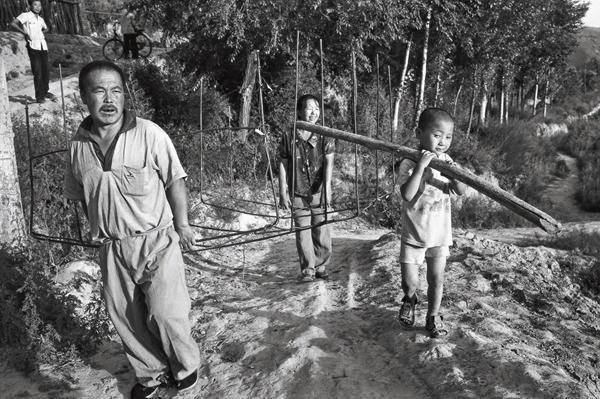 2002年,陕西延安新窑子村,白维兵扛着木头和二伯白有清、二伯母马秀芳一起去干活儿。黑明/摄