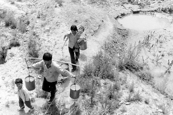 1996年,陕西延安新窑子村,高晶(左一,1991年3月13日出生)跟着父母高志平、王延梅,一起走在挑水回家的路上。黑明/摄