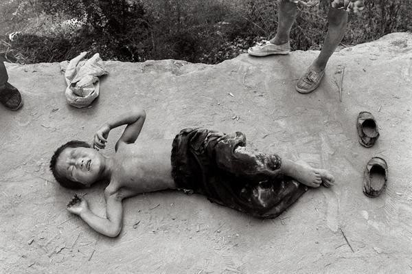 1998年,陕西延安新窑子村,房园(1993年2月26日出生)害怕照相,躺在地上大哭不止。黑明/摄