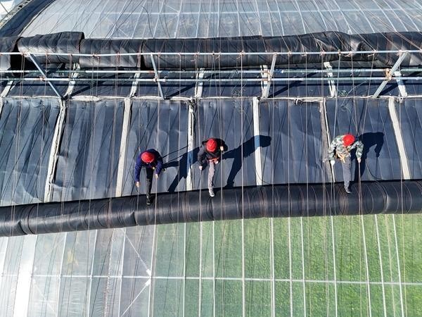 10月23日,江苏连云港,工作人员对高效农业示范园的温室大棚进行维修保养,调试保温棉被、电机线路等基础设施,确保降温期间大棚作物的正常生长。视觉中国供图