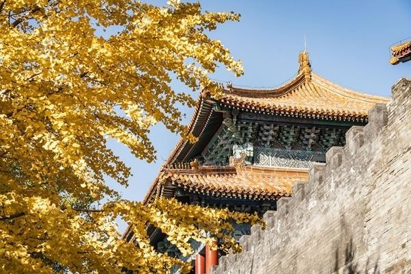 10月27日,随着北京迅速降温,北京故宫周边进入最佳赏秋时节。图为故宫西华门秋色。视觉中国供图