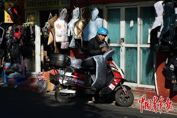 10月20日,北京市最低气温降至0℃以下,北京南二环一家杂货店门口,一位外卖骑手为自己的电动车添上了挡风被。中青报·中青网记者 李强/摄