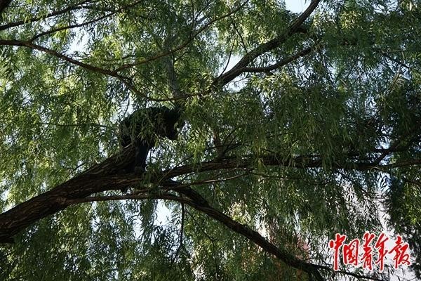 10月20日,北京松榆西里社区,一个男人爬在柳树上,试图修剪一部分挡住阳光的枝叶。中青报·中青网记者 李强/摄