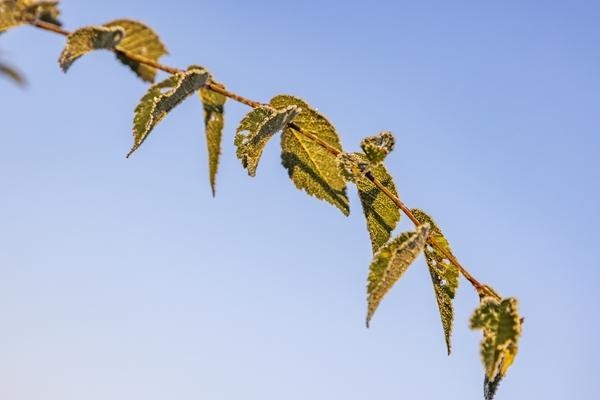10月22至24日,霜降前后,吉林省吉林市永吉县接连降温,最低达到-9℃,永吉县西阳镇狼头村接连3场寒霜,枝头树叶还绿着却已挂霜。视觉中国供图