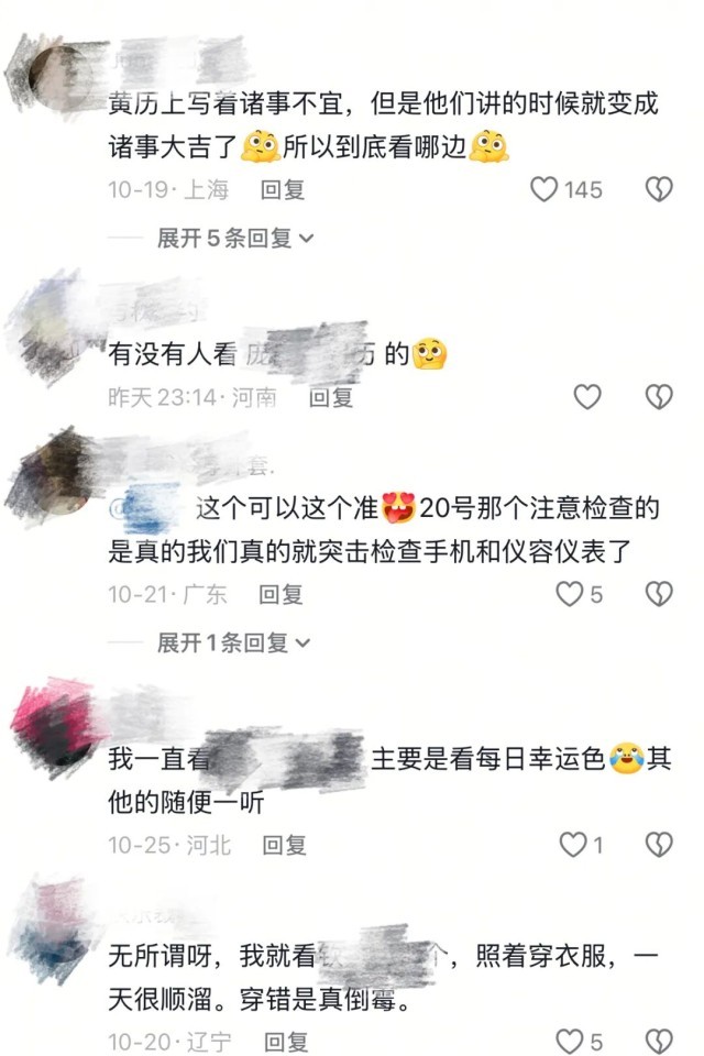 有网友坦言,自己已习惯每天查看电子黄历,甚至因“穿错颜色”而心慌,将日常不顺归咎于未遵循博主建议,“感觉不跟着黄历穿衣服就会走霉运”。