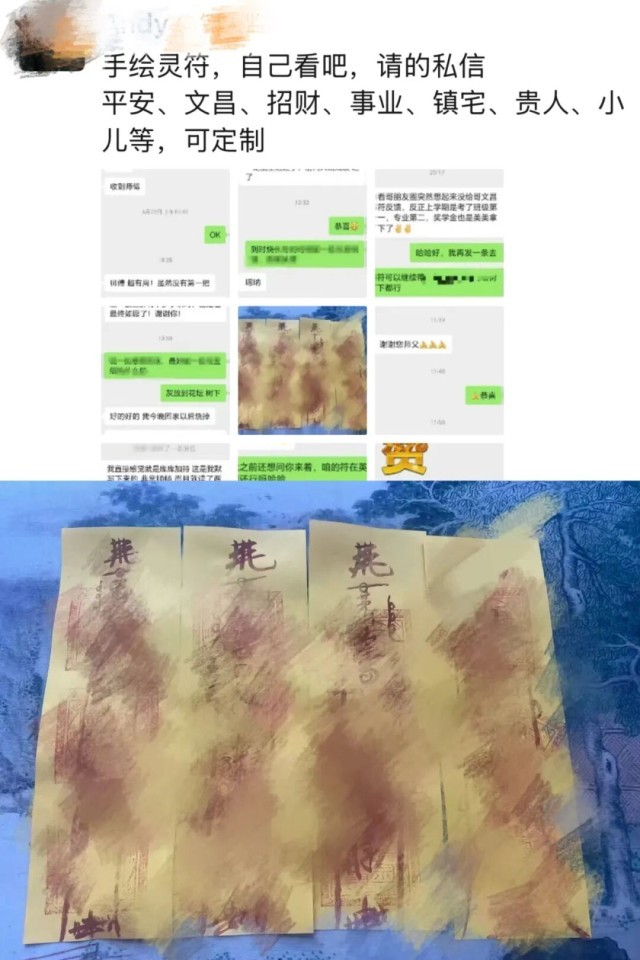 而在其“朋友圈”中,更是直接晒出大量“买家好评”截图,表明可以绘制纸符,为“请符者”实现平安、招财、事业、镇宅等方面的需求。