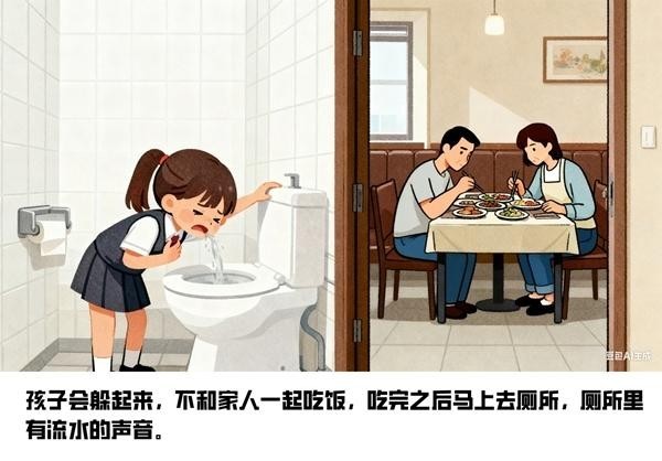 第一,孩子吃东西特别挑。会流露出“这东西不健康”“这东西不安全”“这东西不干净”的想法,会对食物进行非常严格的区分。第二,孩子吃几口饭就饱了,并表示肚子胀。一般正常人如果吃一点就吃饱了,会担心胃是不是出问题了,但是这些孩子一点儿也不担心。第三,他们会躲起来,不和家人一起吃饭,会有吃完饭马上去厕所的行为,有如厕、呕吐、流水的声音,这些迹象家长需要高度关注。