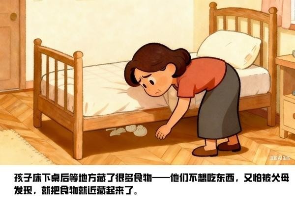 这类孩子还会有藏食的行为。“有的家长可能会发现,孩子床底下藏了很多食物——孩子不想吃东西,怕被父母发现,就把食物给藏起来了。”陈超说。