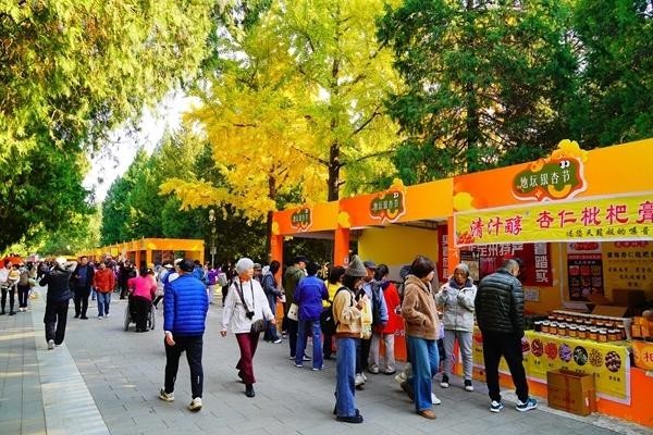进入11月,北京地坛公园的银杏叶簌簌落下。一地金黄中,游客兴奋地捡拾落叶,与最后的秋意合影。金色装饰的摊位环绕银杏大道,作为第十一届地坛银杏文化节(以下称“地坛银杏节”)的组成部分,市集上各色商品琳琅满目,驻足的市民络绎不绝。