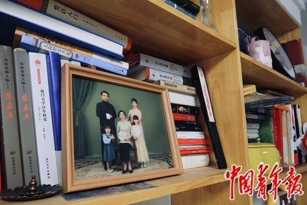 高俊家客厅的书架上,摆放着一家人的合影。画面正中为高母,高父几年前已去世。中青报·中青网记者 杜佳冰/摄