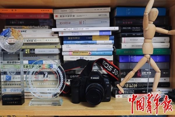 高俊家客厅的整墙书架上,摆放着高俊的老相机和纪录片奖杯,还有不少关于电影的书。中青报·中青网记者 杜佳冰/摄