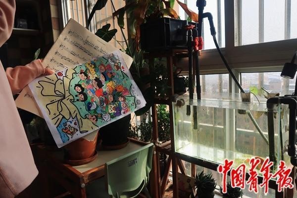 高俊的女儿拿着她的乐谱和画作,此前她在学习这两门兴趣课程。中青报·中青网记者 杜佳冰/摄