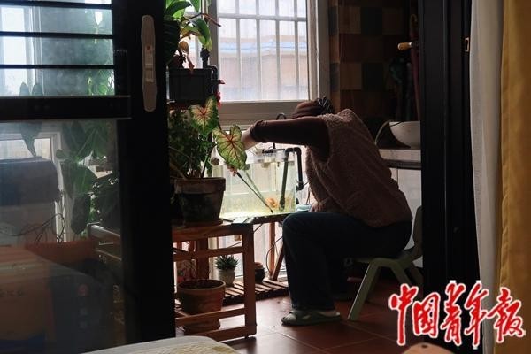 11月8日,高俊走后,妻子王飞帮他照看阳台上的小鱼,她正在清理鱼缸。中青报·中青网记者 杜佳冰/摄