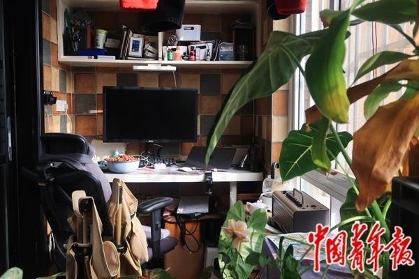 高俊在家中阳台为自己布置的办公区。中青报·中青网记者 杜佳冰/摄