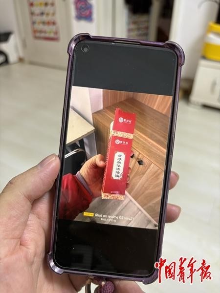 受访者向记者展示紫苏生活超市销售的“紫苏食用植物调和油”。杨雷/摄
