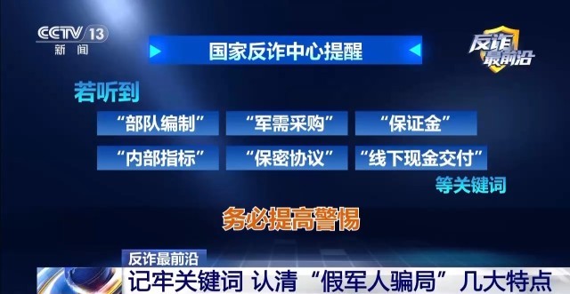 国家反诈中心民警 李振恺:第一个,凡是自称军人,让你交所谓的保证金手续费,或者走内部流程保密渠道的都是骗子。因为正规的部队都有严格的纪律,绝不会向个人收取任何的费用,也不会和你私人进行对接。第二个,如果说你想要核实对方身份,可以找当地的武装部、退役军人的事务局去核实身份。