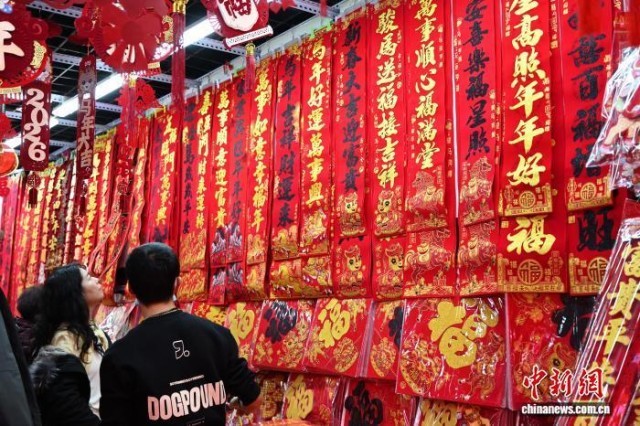 资料图:在四川成都荷花池市场,市民挑选春联。随着春节临近,灯笼、春联等新春饰品逐渐热销。中新社记者 王磊 摄